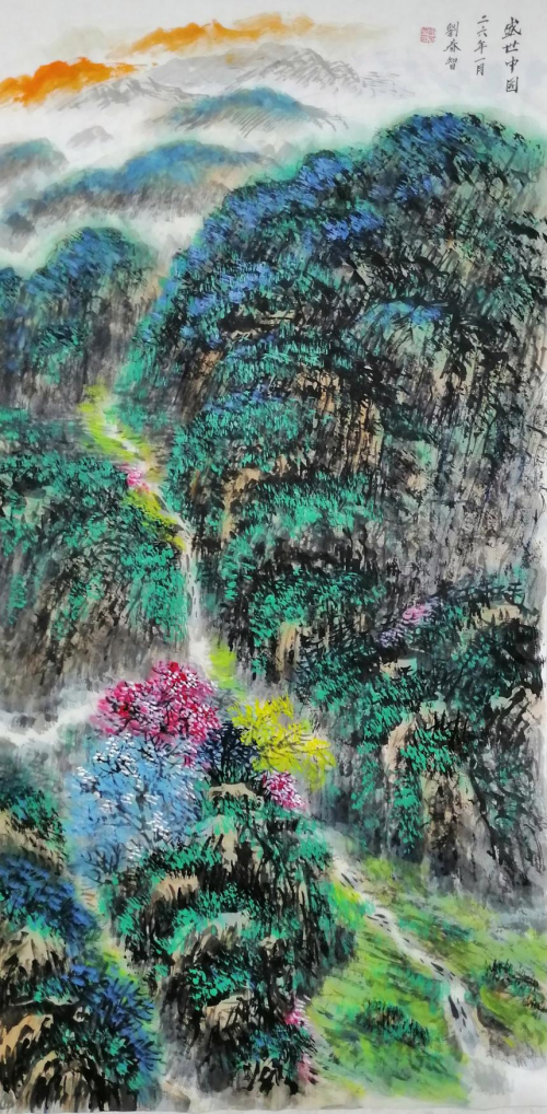 在艺术创作与社会影响方面,刘春智的山水画以秦岭等地域文化为题材,2023年12月,作品《大秦岭》悬挂于政协陕西省西安市委员会办公厅,2024年3月,《南五台霞光》悬挂于陕西省西安市长安区人民政府大楼,通过斧劈皴、雨点皴等传统技法结合青绿或深绛设色与矿物颜料,既传承了北派山水的雄浑气韵,又融入现代审美,体现了“守正创新”的创作理念。还有多幅作品被政府单位、中国国家博物馆收藏,并作为定制画服务于多地政务空间,成为展现文化自信的载体。