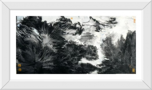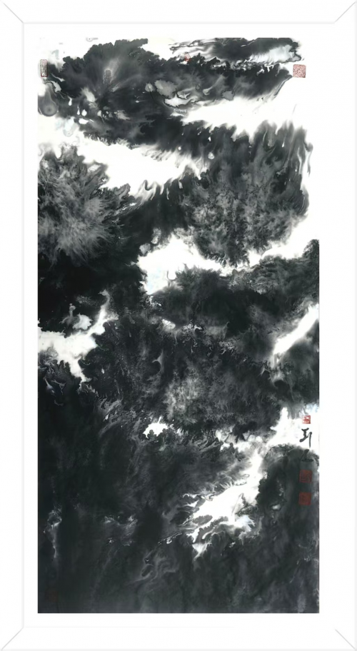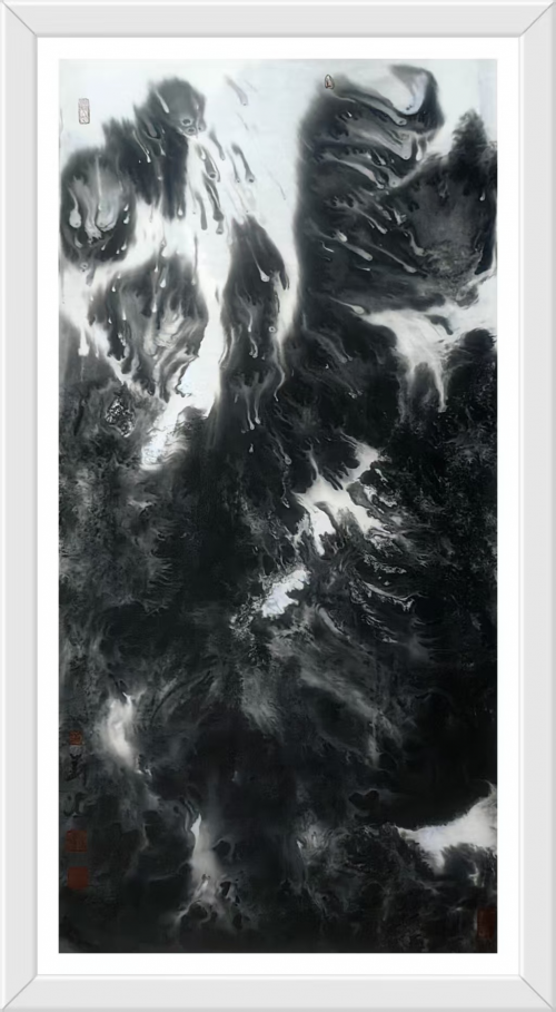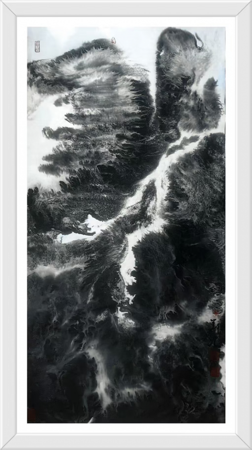 其独创的“元宇宙水墨山水”风格,打破了传统山水画单一视点的局限,通过多重视角的叠加与重组,创造出一种介乎具象与抽象之间的心象风景。画面中的山体结构并非对自然的简单摹写,而是经过心灵沉淀与艺术提炼后的“胸中丘壑”。他擅用积墨法,层层叠加的墨色形成深邃的空间层次,使得画面在看似破碎与错位中,孕育着一种新的秩序感。这种处理方式,既非对西方立体主义的生硬模仿,更像是对当代人多维认知体验的视觉转化,将道家“澄怀观道”的理想与现代社会的时间碎片达成了某种微妙的和解。正如其作品《家山》,虽描绘的是故园情怀,却通过独特的构图与笔墨语言,营造出一种既真实又可亲、既具体又充满想象的情感空间,成为无数游子心头的精神原乡。