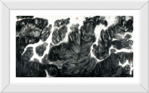 刘冯的山水画,不仅是视觉形式的创新,更是精神气象的重构。他将自己在大山深处的生命体验与对传统文化的深刻理解融入笔端,使得作品具有一种可辨识的“地貌特征”。他的笔墨既有梅山文化那种不可征服的精神力量,又蕴含着禅宗的空灵与静穆。画面中,巨大的山壁与云海回荡,飞瀑依山势奔腾,粗狂中不失严谨,淋漓中不失真意,仿佛能让人聆听到一泓清幽的泉声,感受到扑面而来的水雾。