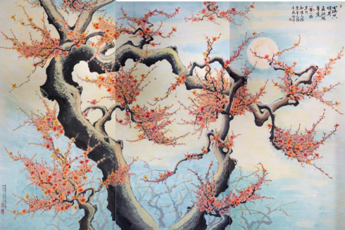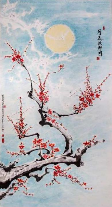 《月是故乡明》 98X178 ㎝ 红梅映明月,牵我游子心。景是家乡美,月是 故乡明。 (此作被国宴国酒艺术茅台用作包装图案)