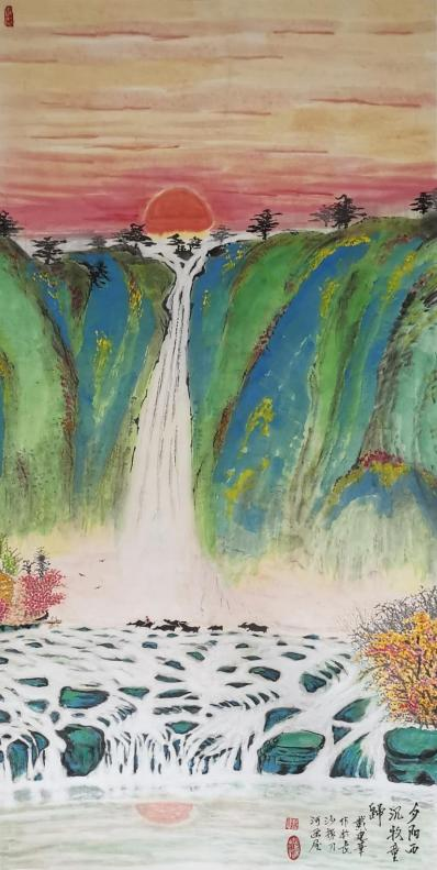 野水秋风劲, 山青云自飞。日暮苍山远,鸭引牧童归。(此作被中国邮政 印制成邮品纪念票发行)